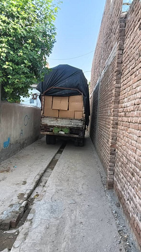 アフガン医療連合センターの倉庫へランドセルを搬入するために、トラックは狭い通路を進入しました。