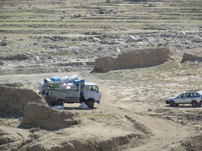 ランドセルを積んだアフガン医療連合のトラックがチャルガジ村に到着しました。(アチン郡チャルガジ村)