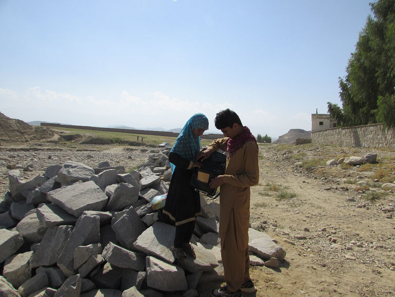 兄は妹のランドセルを非常に嬉しく誇りに思いました。兄は妹のランドセルに入っている学用品を一つひとつ確かめ、妹にこのランドセルでしっかりと勉強をして、将来、アフガニスタンのために立派な医者になって欲しいという気持ちを伝えました。(アチン郡マルーフチーナ村)